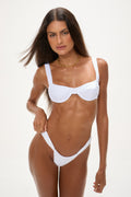 The Bambi Bottom in Blanco is a Brazilian-style bikini bottom designed with a wide, seamless waistband and adjustable ruching at the front and back — so you can choose your perfect level of coverage.