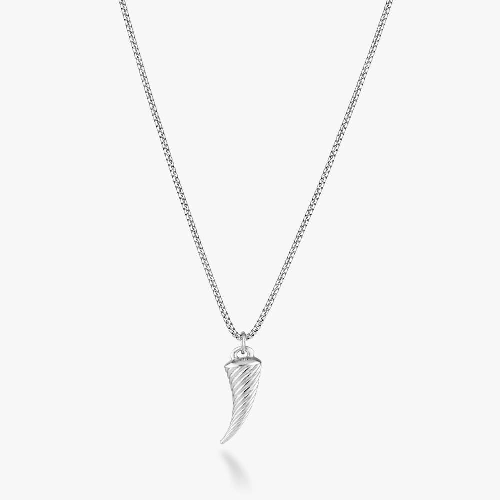 A modern take on an ancient symbol. This Italian-made horn pendant necklace, crafted from rhodium-plated 925 sterling silver, showcases a polished rope-textured design that adds subtle detail and shine. Traditionally worn as a symbol of good luck and protection, the horn’s sleek silhouette makes it a stylish and meaningful everyday piece. Whether worn solo on a chain or layered with other favorites, it adds a bold yet refined touch to any look—casual or formal.