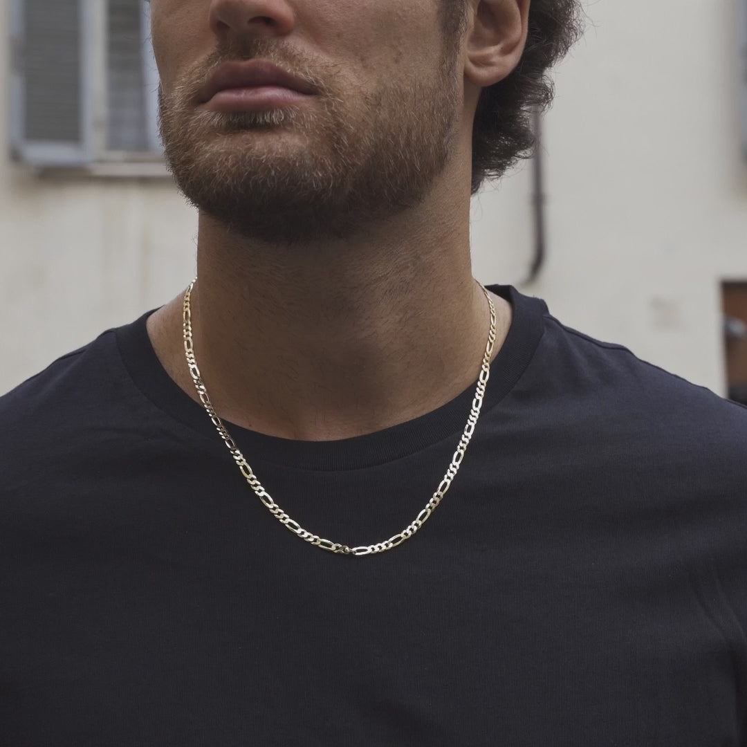Elevate your everyday look with this bold and versatile 5mm Figaro chain, crafted in Italy from 18K gold over solid 925 sterling silver. The flat, diamond-cut beveled links catch the light beautifully, creating a rich shine and a sleek finish. Thick, strong, and durable, this chain is designed for daily wear—yet its thoughtful design ensures a comfortable fit that never feels bulky. Whether worn solo for a statement look, paired with a favorite pendant, or layered with other chains, this piece brings timeless style to any outfit.