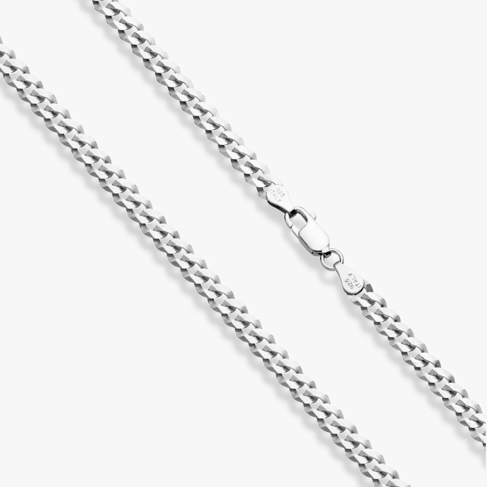 Refined, bold, and built to last. This 5mm Figaro chain is crafted in Italy from solid 925 sterling silver and features flat, diamond-cut beveled links that catch the light for a bright, polished finish. Its classic pattern offers a timeless look with a modern edge, and the sturdy spring ring clasp ensures a secure fit. Strong yet comfortable, this chain is ideal for daily wear—whether on its own, paired with a favorite pendant or charm, or layered with other pieces for a personal touch.