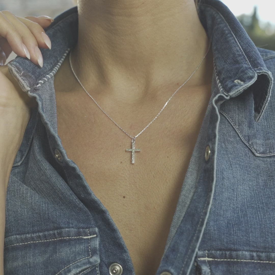 Elegant and full of meaning, this Italian-made necklace features a delicate 18x12mm hand-hammered cross pendant crafted in 18K gold over sterling silver. The small cross hangs from a fine 18-inch chain and offers a beautiful way to express your faith or make a subtle fashion statement. It's simple yet artisan-crafted design makes it ideal for everyday wear, whether you’re dressing up or keeping it casual. Wear it solo for a refined look or layer it with your favorite chains for a modern touch.
