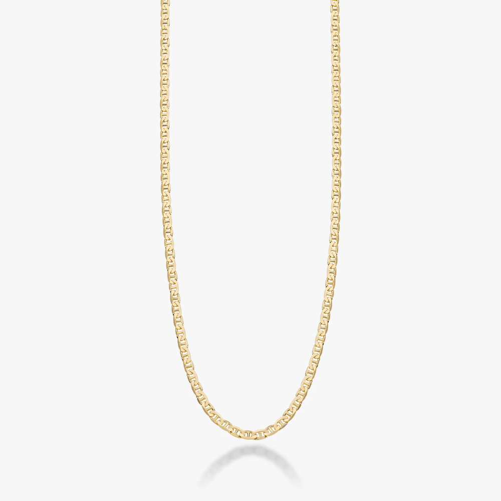 Classic with a modern edge, this 3mm Mariner chain is crafted in Italy from solid 925 sterling silver and finished in 18K gold for a warm, radiant glow. Featuring wide, iconic oval links that are polished and diamond-cut, it delivers a rich shine and a timeless silhouette. Durable yet lightweight, this piece lays flat for a comfortable everyday fit. Wear it solo for a clean, understated look, with a favorite pendant for personal flair, or layered with other chains to add depth and dimension to any outfit.
