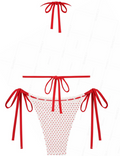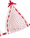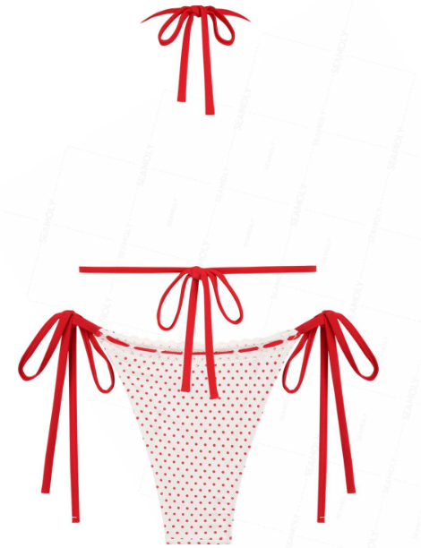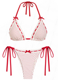 POLKA DOT HOLIDAY DREAM – Make spirits bright in the Polka Dot Holiday Dream Bikini Set. This vintage-inspired swimsuit brings playful charm with its classic polka dot print, delicate lace trim, and a sweet bowknot detail. The halter-style triangle top and tie-side bottoms offer adjustable comfort with a flirty, flattering fit. Whether you’re lounging poolside, celebrating under the sun, or escaping for a festive getaway, this bikini delivers retro glam with a holiday twist.